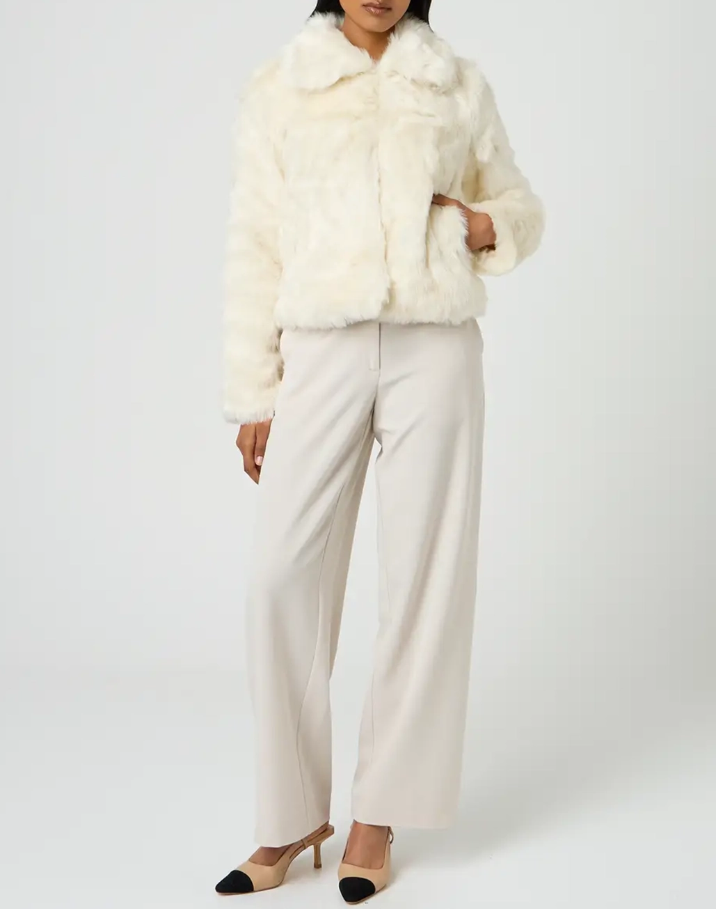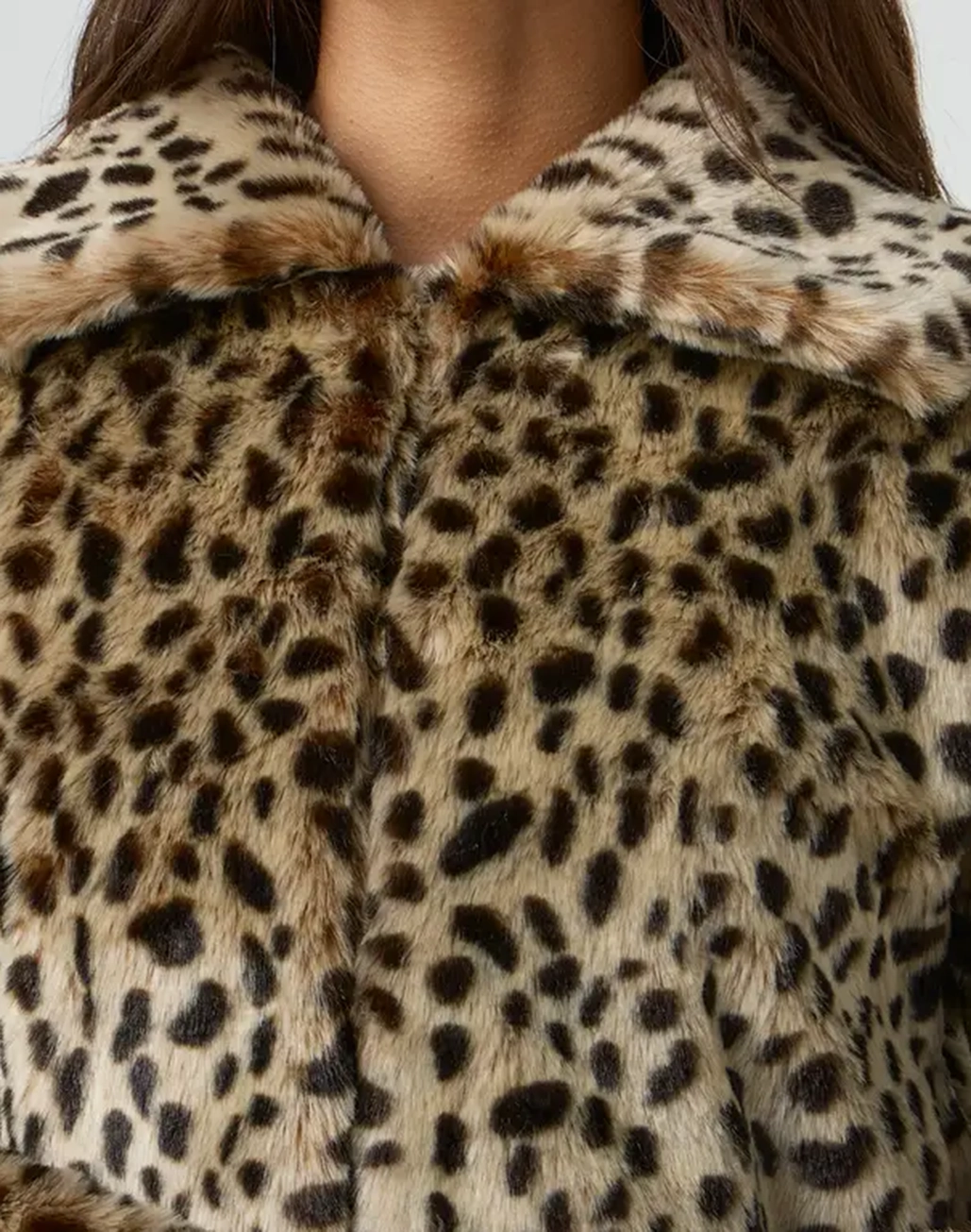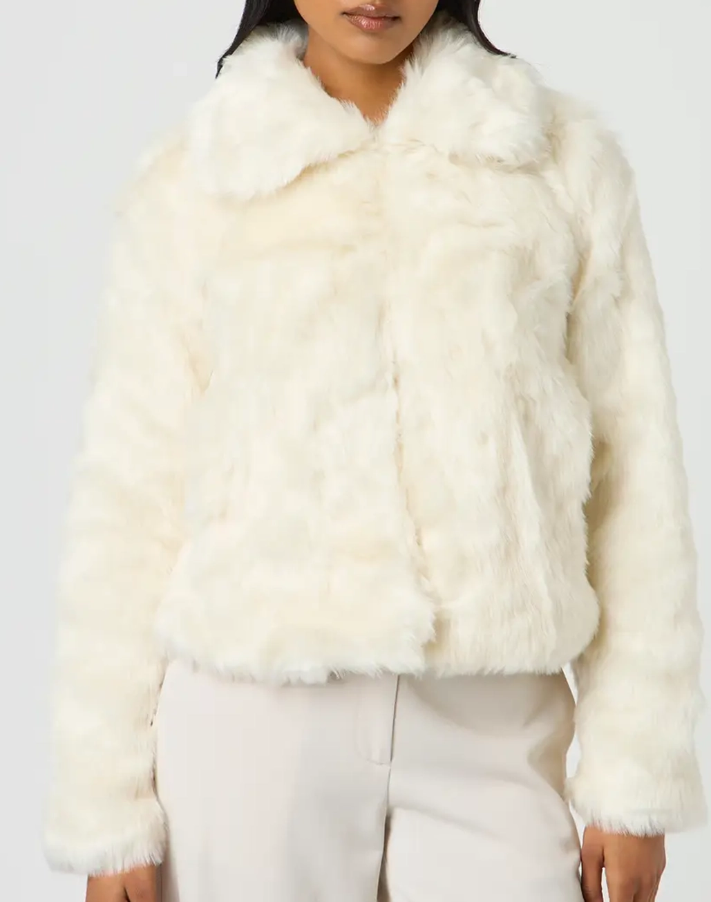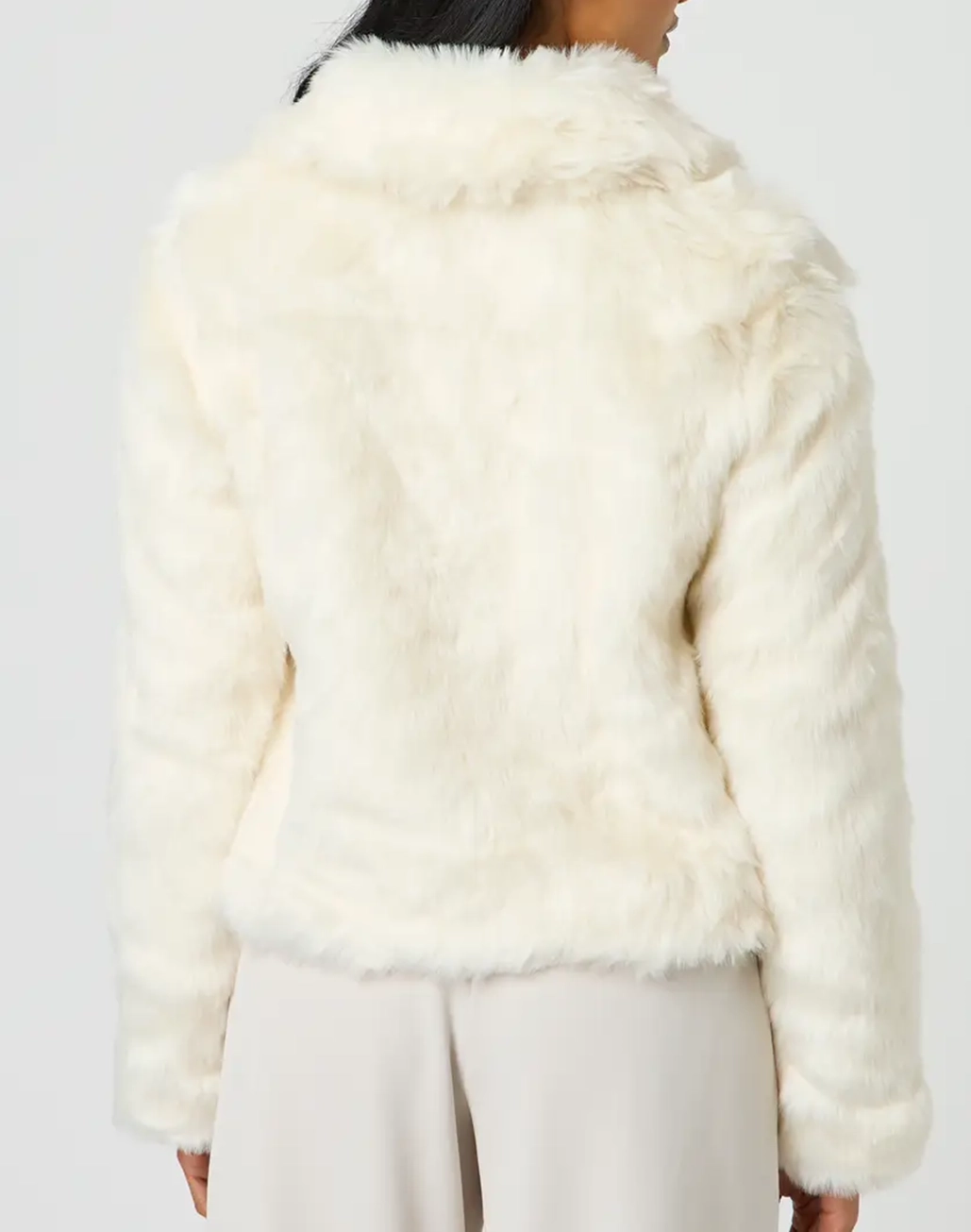 This faux fur coat features an oversized collar, front hook closure and a full length.