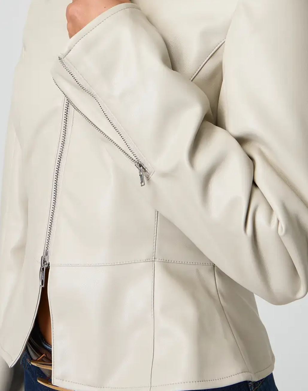 This faux leather jacket features a fitted fit with a peplum fashion forward design.