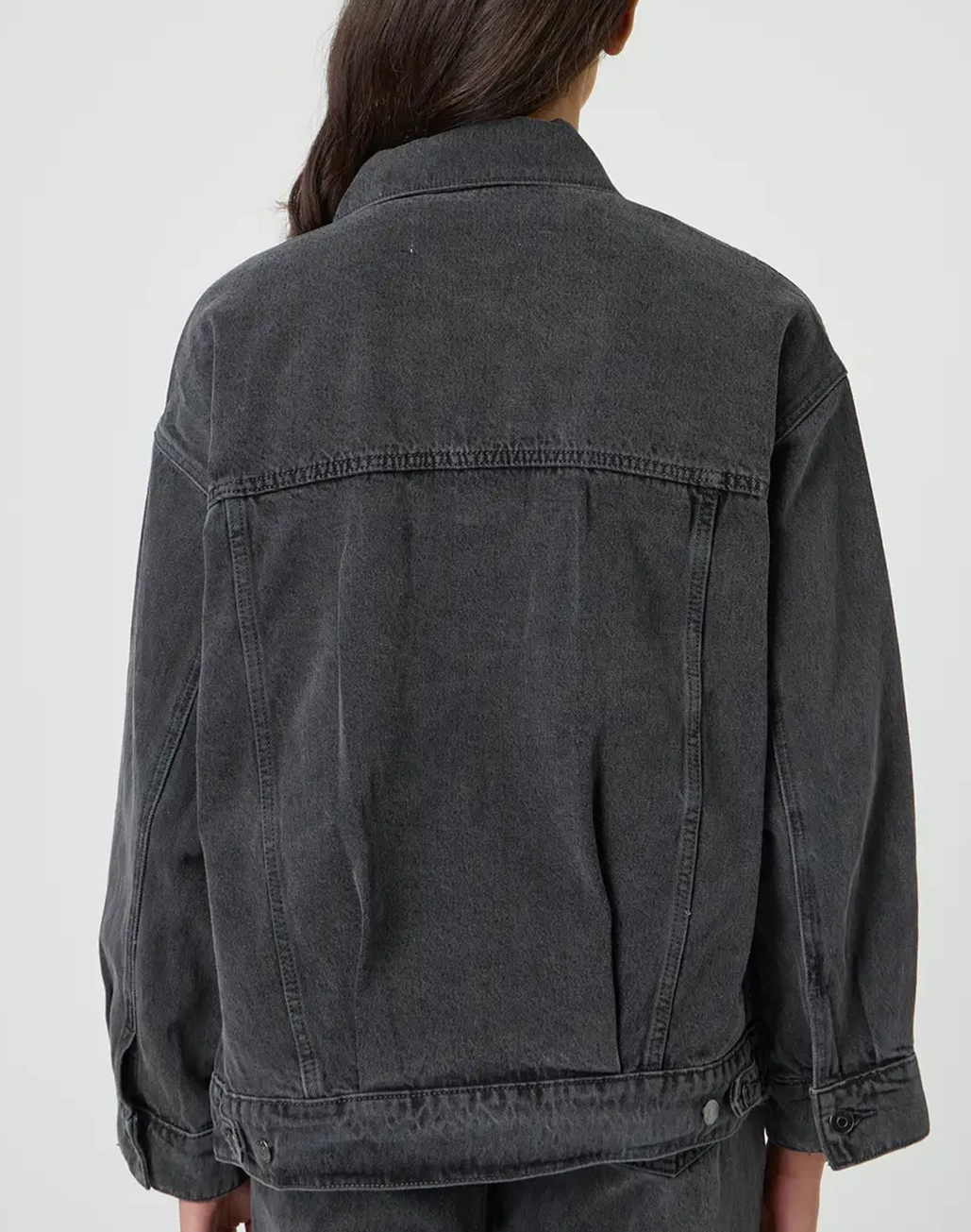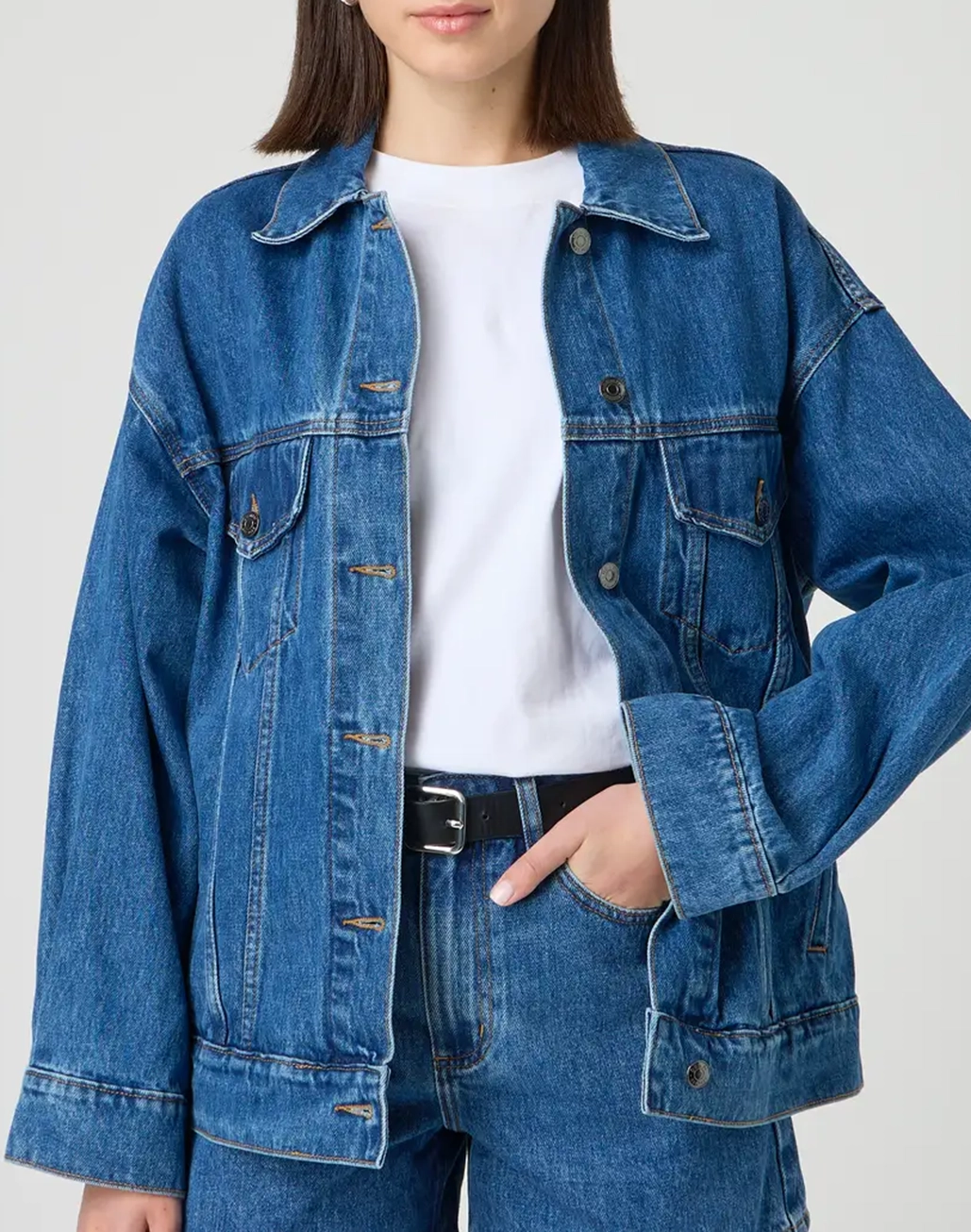 This denim jacket features a longline length, a collar, a button up front and front pockets.