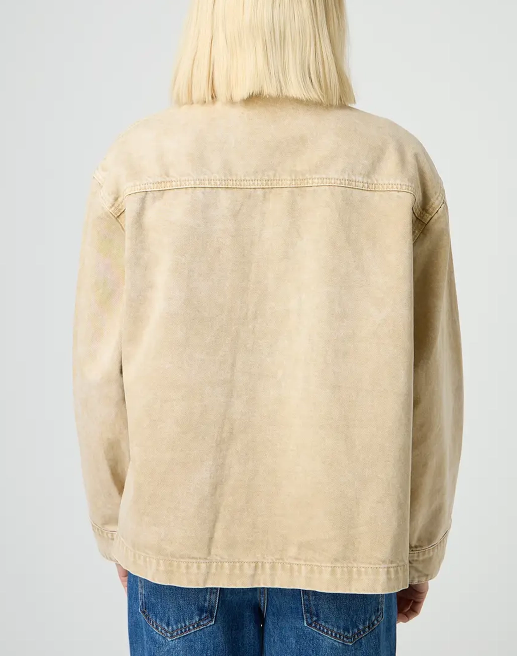 This jacket features front pockets and full button up front with an oversized fit.